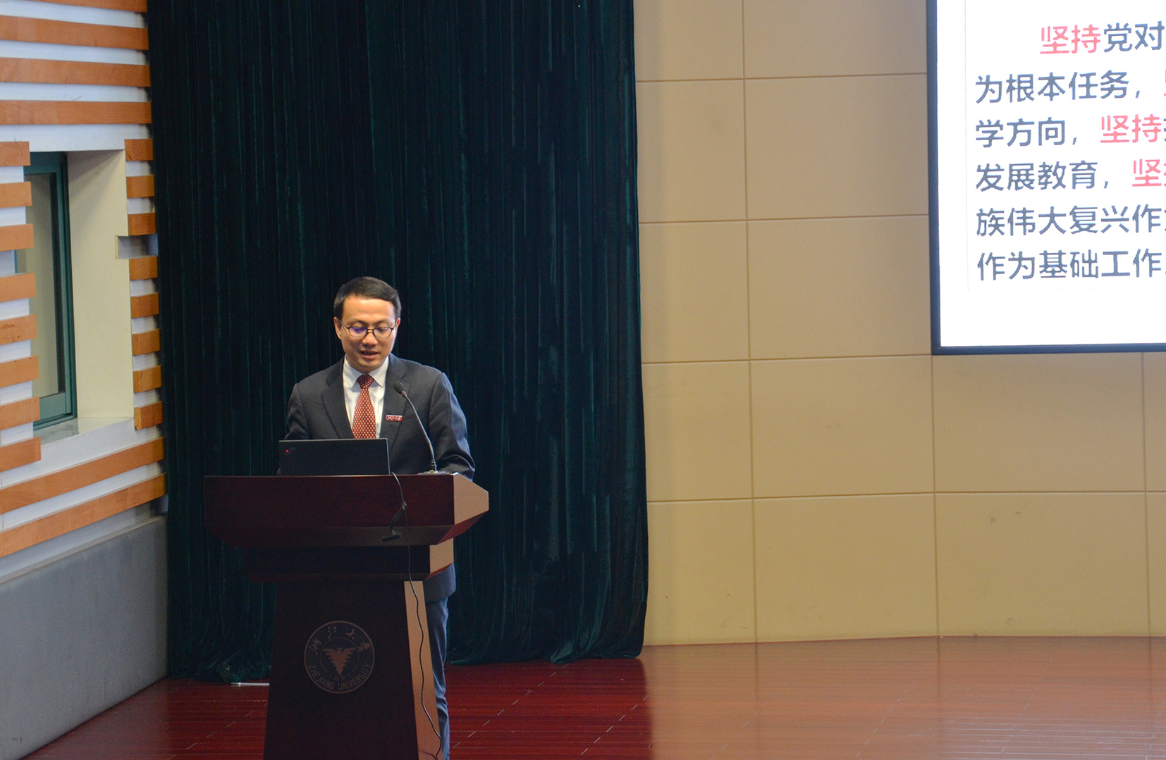 随后,研究生院院长周天华以“新时代卓越研究生教育改革与实践”为题作研究生教育教学工作报告。他结合我校“三步走”战略,分析世界顶尖大学研究生教育特色,阐明新时代研究生教育愿景与内涵,从招生改革、课程教学、研究生教育国际化、多学交叉人才培养、中期考核、资助育人、学籍管理、学位论文质量保障、研究生思政教育、导师队伍建设、学科建设(学位点建设)等多方面阐释2018年研究生教育工作的进展,并对2019年研究生教育提出了三项重点工作:一、深入推进博士研究生教育综合改革;二、深化专业学位综合改革;三、全面推进综合交叉的一流学科体系建设。