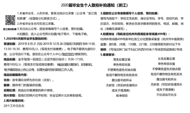 (2)本次图像采集由新华社浙江分社图像采集中心负责拍摄,收费20元/每人;提供2寸4张及1寸8张纸质照片一版,用于学历、学位证书使用;并上传电子版到学信网。各学院(系)需事先收齐拍摄费(现金、支付宝均可),在拍照当天交新华社浙江分社高校毕业生图像采集中心人员。